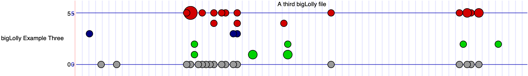 track type=bigLolly name="bigLolly Example Three" description="A third bigLolly file" bigDataUrl=http://genome.ucsc.edu/goldenPath/help/examples/bigLollyExample3.bb lollySizeField=lollySize visibility=full yAxisLabel.0="0 on 30,30,190 0" yAxisLabel.1="5 on 30,30,190 5" lollyMaxSize=10 lollyNoStems=on