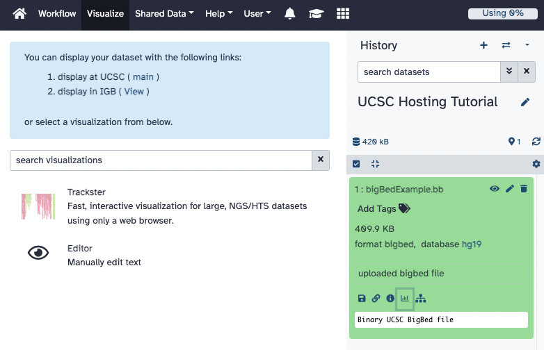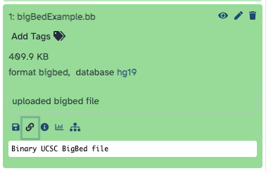 3. Once the file is uploaded to Galaxy, it will appear in the "History" section on the right-hand side. Click on the file to expand the menu, and additional information about the file such as the file size, format, and the database. Towards the bottom of the menu, five icons are displayed that perform different functions on Galaxy. Clicking on the "graph icon" will bring up another menu in the middle of the screen with a link to visualize the bigBed file on the UCSC Genome Browser.
