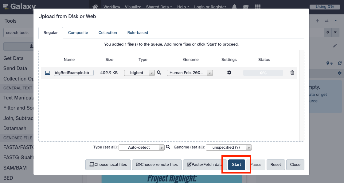 2. On the pop-up menu, click the "Choose local files" to select the file to host. Once the file is selected, select the genome and file type from the drop-down menus, and click the "Start" button. For this example, we will upload a bigBed file for the GRCh37/hg19 genome to Galaxy.