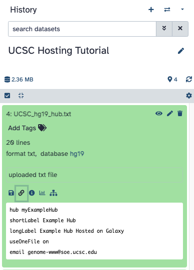 4. After creating the hub on your local computer, upload the hub.txt file to Galaxy. Once the file is on Galaxy, click on the hub.txt file to expand the menu. Again, click on the "chain-link" icon to obtain the URL to the hub.txt file. Now, navigate to the UCSC Genome Browser's Track Hubs page and enter the URL to view the hub.