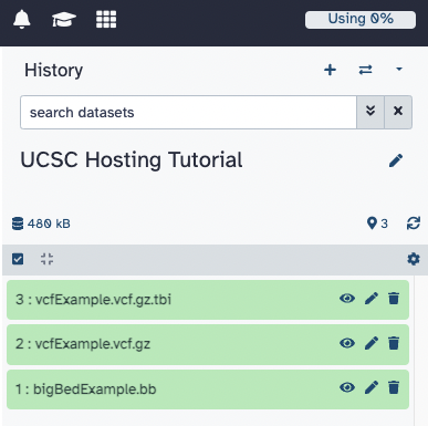 1. Similar to the step in the previous example, sign into your Galaxy account and upload the files to Galaxy. For this example, we will be uploading a bigBed, a VCF, and a VCF index file to view on the GRCh37/hg19 genome as a track hub.