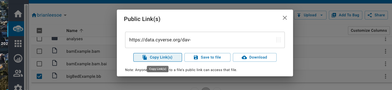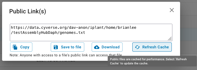 Note, if you need to replace files once they have been uploaded into CyVerse's DE and Public links have already been created you will need to force update the CyVerse cache. One way is to go back to the Public links section and find "Refresh Cache" button. Another way is by hitting Control-Shift-R in your browser to force reload the file or by sending Cache-Control: no-cache header: curl --head --header 'Cache-Control: no-cache' https://data.cyverse.org/.../dataFile.bam