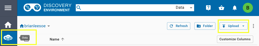In order to host your data on CyVerse, you first must create an account and then use their Discovery Environment to upload data. After creating an account and signing in, access the data screen by clicking the second icon on the left. Use the "Upload" button on the far right to import data from a URL or locally from your machine.