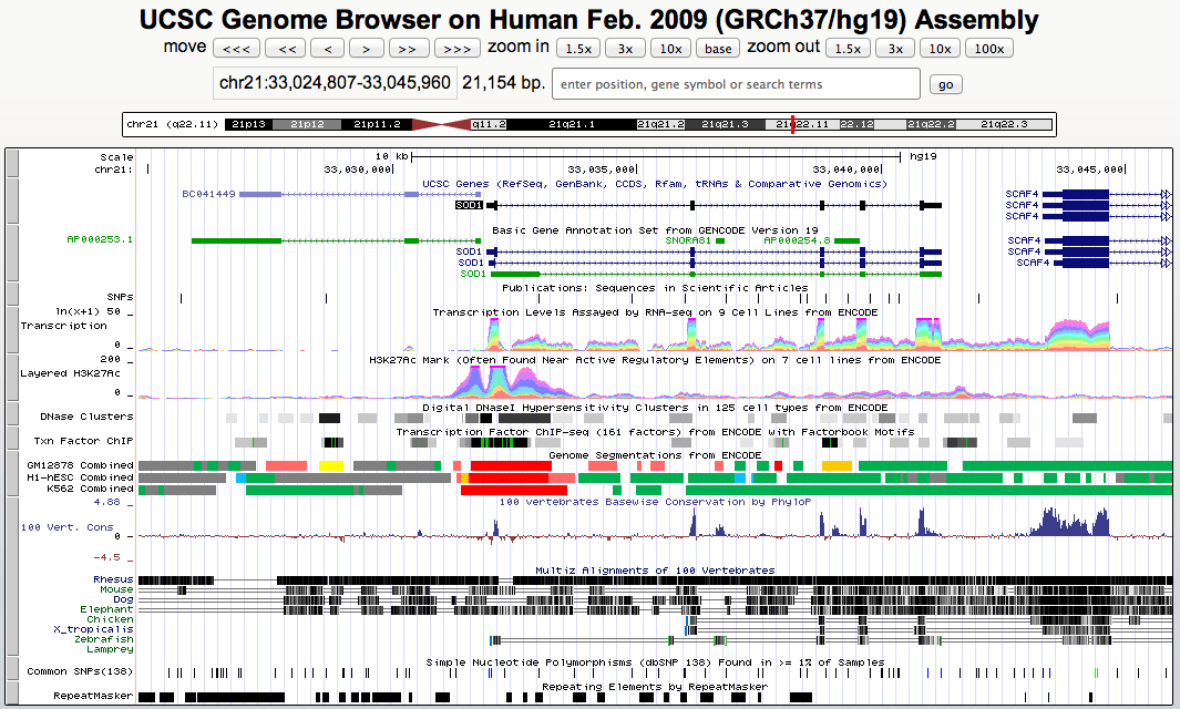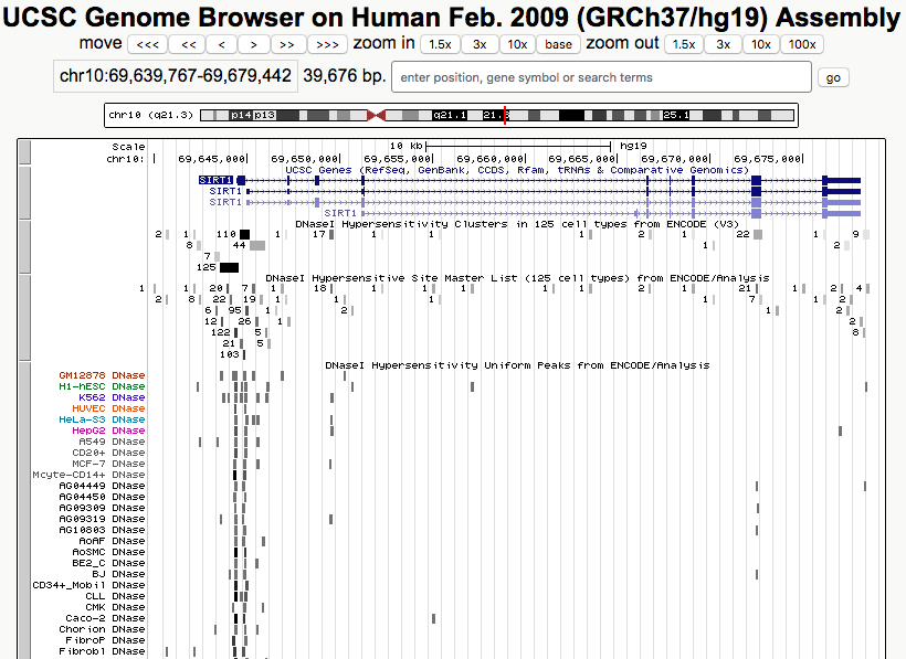 The above session highlights some key integrated track data from the ENCODE project including GENCODE gene sets, Transcription Levels by RNA-seq, H3K27Ac histone mark, DNaseI Hypersensitivity, ChIP-seq Transcription Factor binding sites, and Genome Segmentations.
