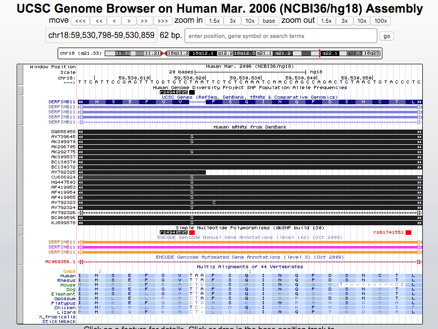 The top track in the above session displays OMIM allelic variants. By clicking the items one can learn the details and find additional links to the allelic variants in the Online Mendelian Inheritance in Man (OMIM) database.
