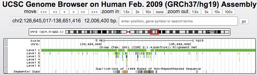 hg19 (chr2:126,645,017-138,651,416) coincide with the centromere in the Chimp chr2B: