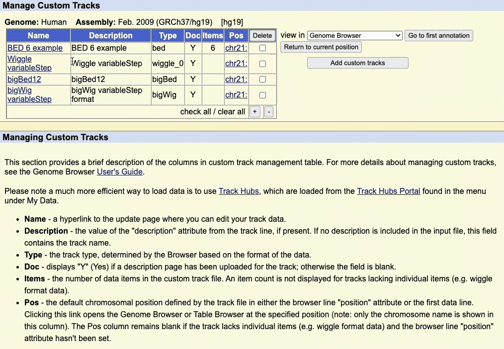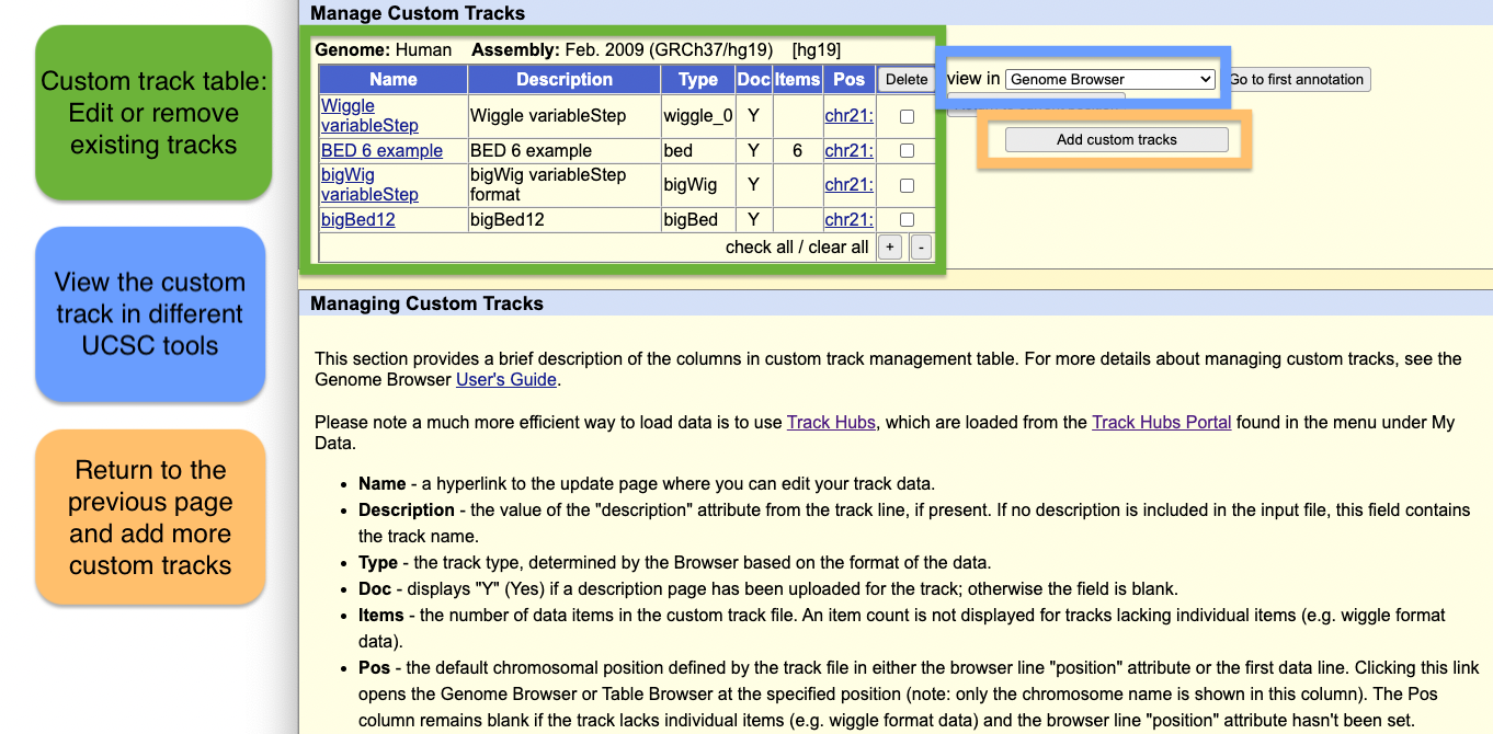Click to upload the data to the UCSC Genome Browser. You will be taken to a new page where you can view all your uploaded custom tracks. Here, you can edit the annotation data, or remove any custom tracks.